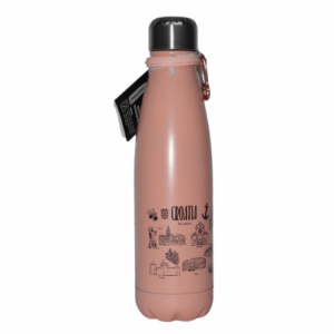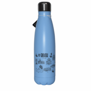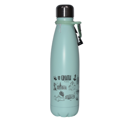 Moderni dizajn u svijetloplavoj, zelenoj i breskvastoj boji, s crnim motivima Hrvatske. Održava temperaturu pića i lako se prenosi zahvaljujući praktičnoj kukici.