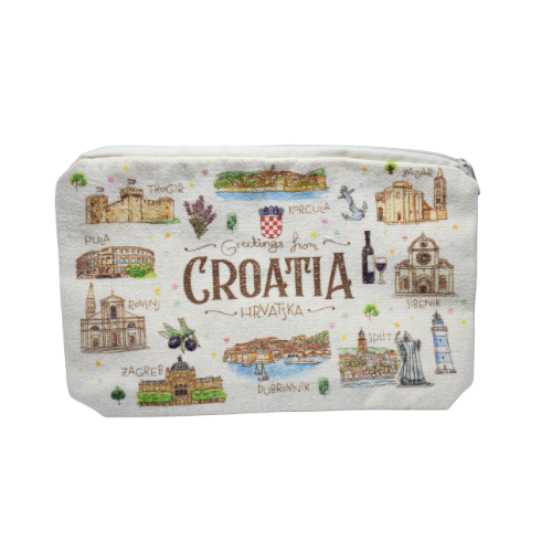 Praktična platnena torbica s ilustracijama hrvatskih gradova i prirodnih motiva. Idealna za putovanja, sitnice ili kao suvenir s domaćim šarmom.